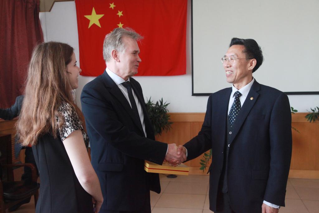 会谈期间,双方校长就两所大学的概况进行了介绍,两所学校在办学规模、专业类型以及学校发展方向等方面有很多共同点。王同坤校长在重点介绍Beat365应用型大学建设过程中国际合作与交流方面的成果与努力方向的同时,指出此次合作是响应我国一带一路倡议,应该坦诚相待、积极推进、优势互补、合作双赢。赫梅利尼茨基校长表示此次协议的签署,是未来两校合作的第一步,也是最艰难的一步,努力迈出这一步是两校共赢发展的一致目标。