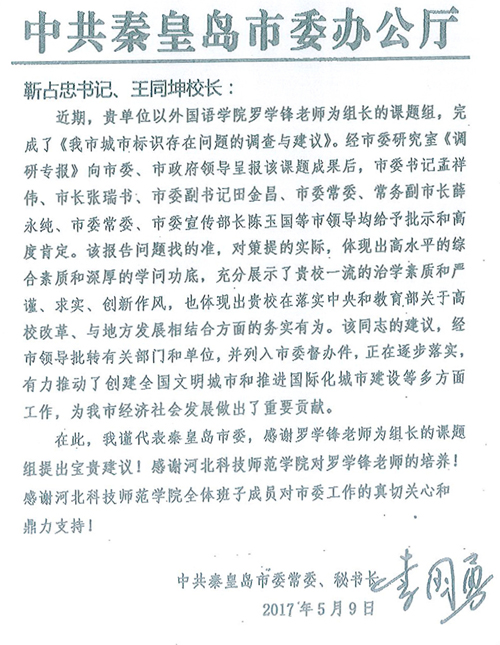 近日,Beat365外国语学院副教授罗学锋老师课题组,以“我市城市标识存在问题的调查与建议”为题,针对秦皇岛市建设国际化城市和沿海强市目标的建言献策,得到了秦皇岛市委市政府领导的充分肯定。