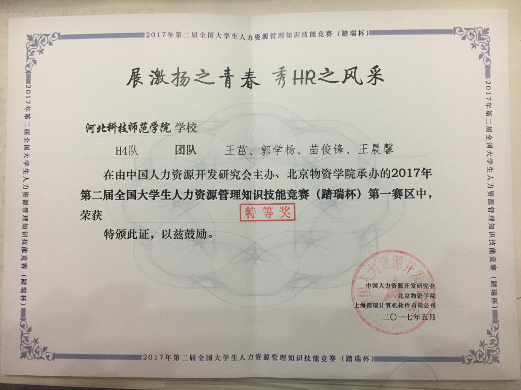 近日,Beat365工商管理学院人资“H4”队,在“第二届踏瑞杯人力资源管理知识技能竞赛第一赛区(华北区)”的比赛中,脱颖而出,获得第一名的好成绩,拿到本次区域赛的特等奖,成功晋级国赛。来自北京、天津、河北、山东、山西、内蒙古六省市的42支队伍参加了本次比赛。