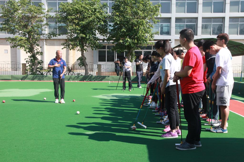 在昌黎校区,张权教练员从门球运动的起源与发展、现代门球运动的发展趋势给大学生做了一堂精彩的讲解。在实践教学中着重从门球握杆姿势、站位、瞄准、挥杆、击球、檫球、闪击等技术、技巧做了形象的指导,通过双人赛、三人赛、五人赛为同学们演示了现代门球竞技的战术思想、技术的关键,让同学们大饱眼福、开阔了视野。