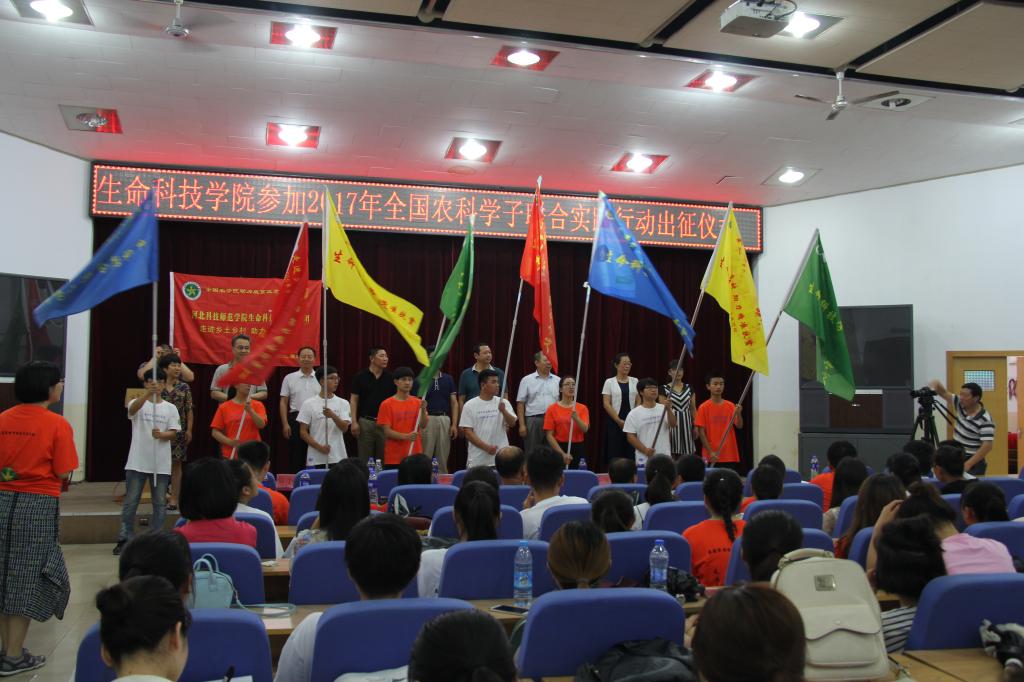 在激扬的乐曲中,参会领导和嘉宾为8支实践小分队授旗,标志着生命科技学院参加“2017年全国农科学子联合实践行动”已经全面铺开。