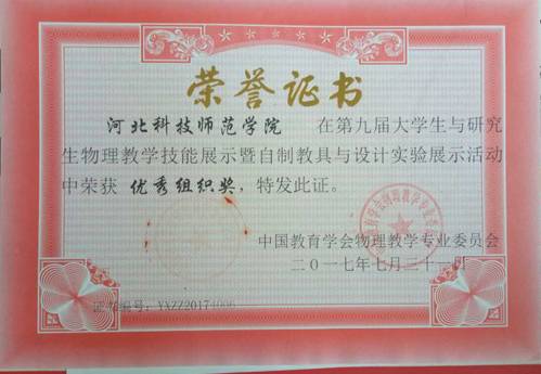 2017年7月29日至31日由中国教育学会物理教学专业委员会主办、青岛大学承办的第九届全国大学生与研究生物理教学技能展示暨自制教具与设计实验展示活动在山东青岛大学举行。本次活动吸引了来自北京师范大学、华东师范大学、东北师范大学、华中师范大学等95所师范院校的800余名学生参加。