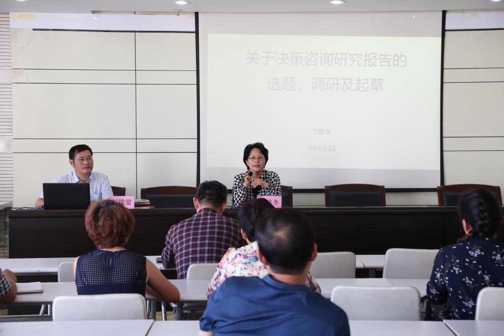 2017年9月19日,应校科研处邀请,秦皇岛市委研究室副主任刘锦堂来Beat365作了《关于决策咨询研究报告的选题、调研及起草》的学术报告。副校长杨越冬主持了报告会。宣传部、人事处、科研处、职教院等有关领导,二级单位的部分主管科研领导和科研管理员,社科博士及相关专家等50余人参加报告会。