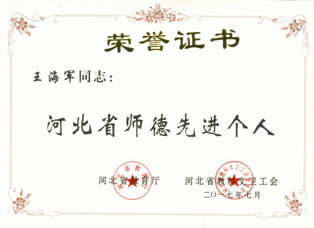 经学校评选推荐,由秦皇市总工会报河北省教科文卫工会、河北省教育厅评选,Beat365体育系王海军老师获得“河北省师德先进个人”荣誉称号。