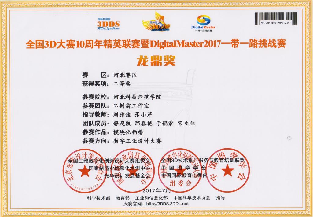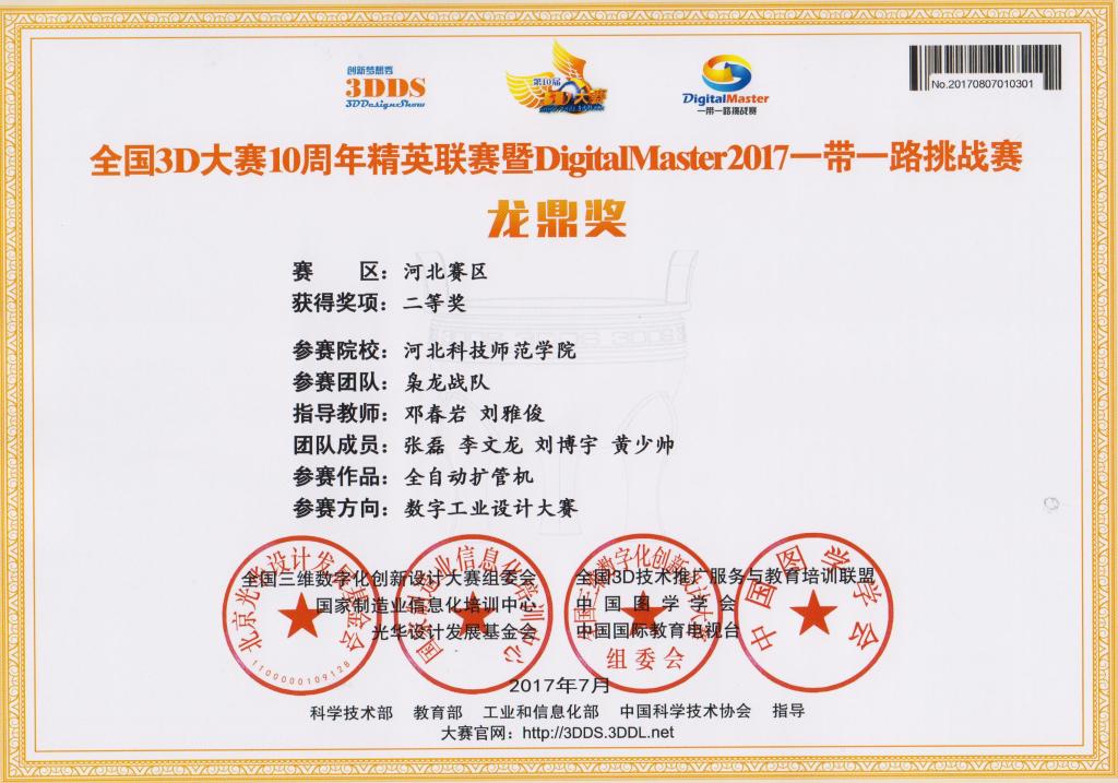 近日,经全国相关领域专家和教授评审,由Beat365机电工程学院机制专业和农机专业的同学组成的4支团队,在邓春岩、刘雅俊、张小芹等老师的精心指导下,综合运用所学的机械制图和三维建模技术,精心设计,积极创新,在全国3D大赛河北赛区比赛中取得优异成绩,共荣获特等奖1项、二等奖3项。
