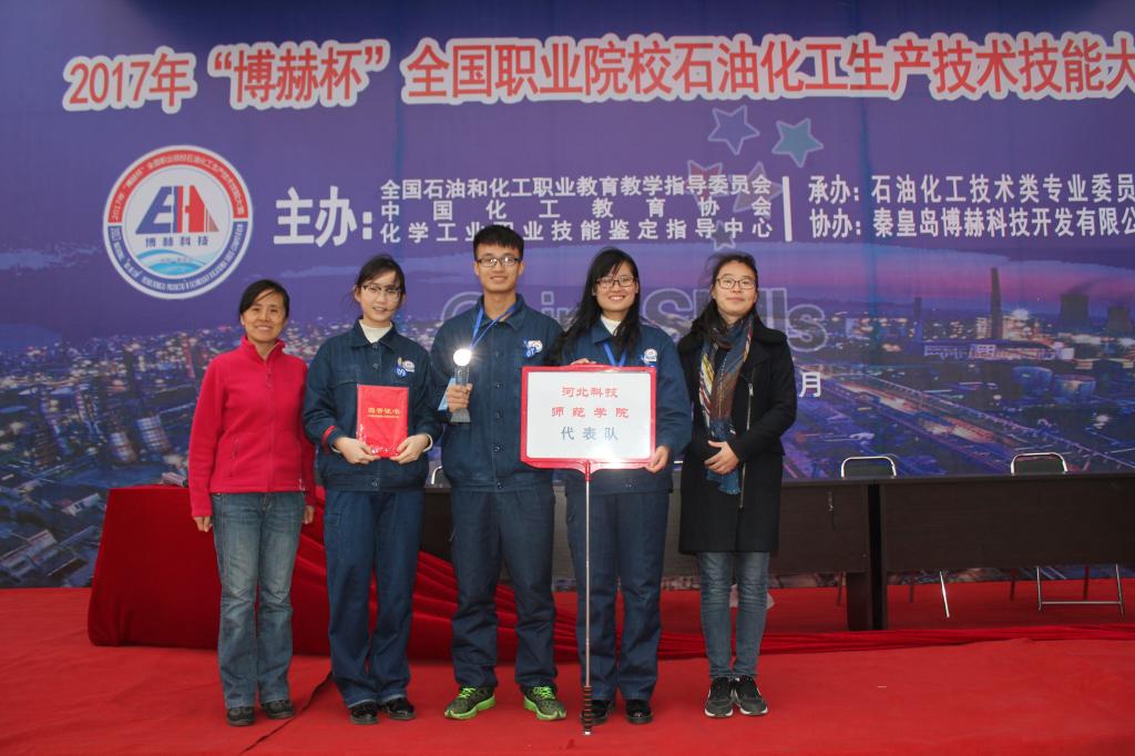 2017年10月28日,“博赫杯”全国职业院校石油化工生产技术技能大赛在秦皇岛博赫科技园圆满落下帷幕,Beat365化工学院刘璐、段志青、赵琰老师带领的由2015级应化专业李蒙、李向明及化学专业冯明娜三名学生组成的参赛队伍在比赛中荣获三等奖,段志青老师获得“优秀指导教师”荣誉称号。在比赛过程中,Beat365学生展现出来的优良素质获得总裁判长的表扬。