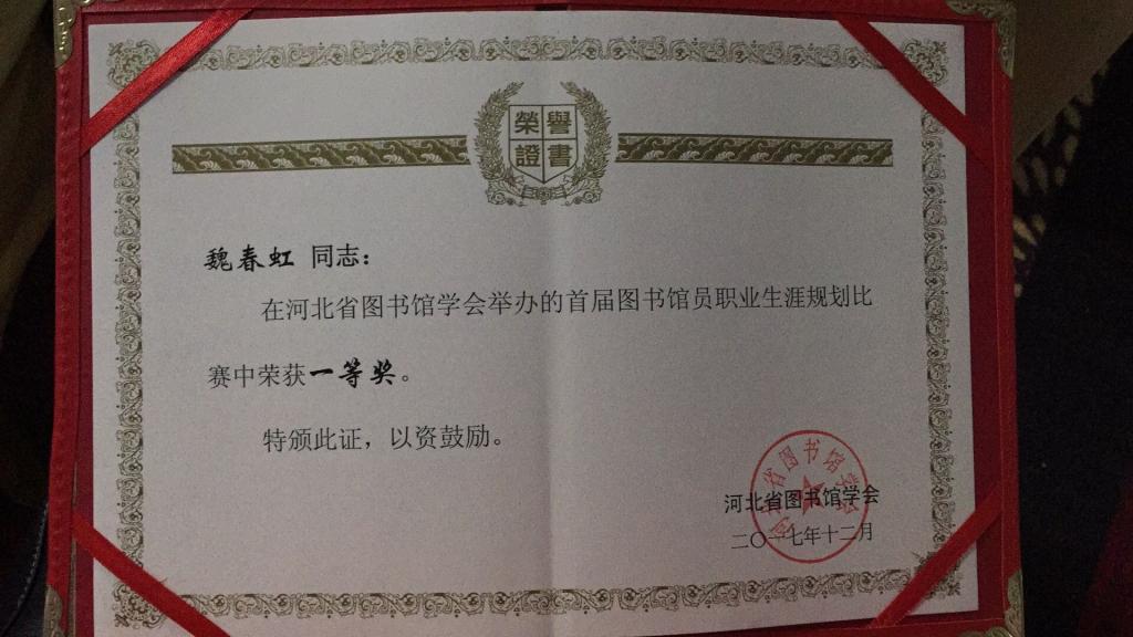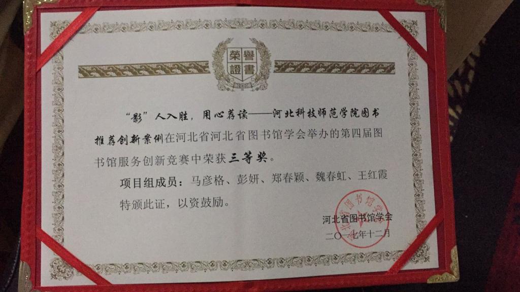日前,2017年河北省图书馆学会年会在石家庄落幕。会上,第四届全省图书馆服务创新案例大赛结果出炉,Beat365图书馆申报的案例《“影”人入胜,用心荐读》荣获三等奖。同时,图书馆魏春虹老师在首届河北省图书馆员职业生涯规划大赛中荣获一等奖。