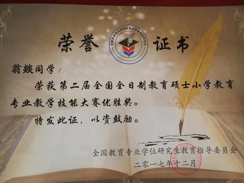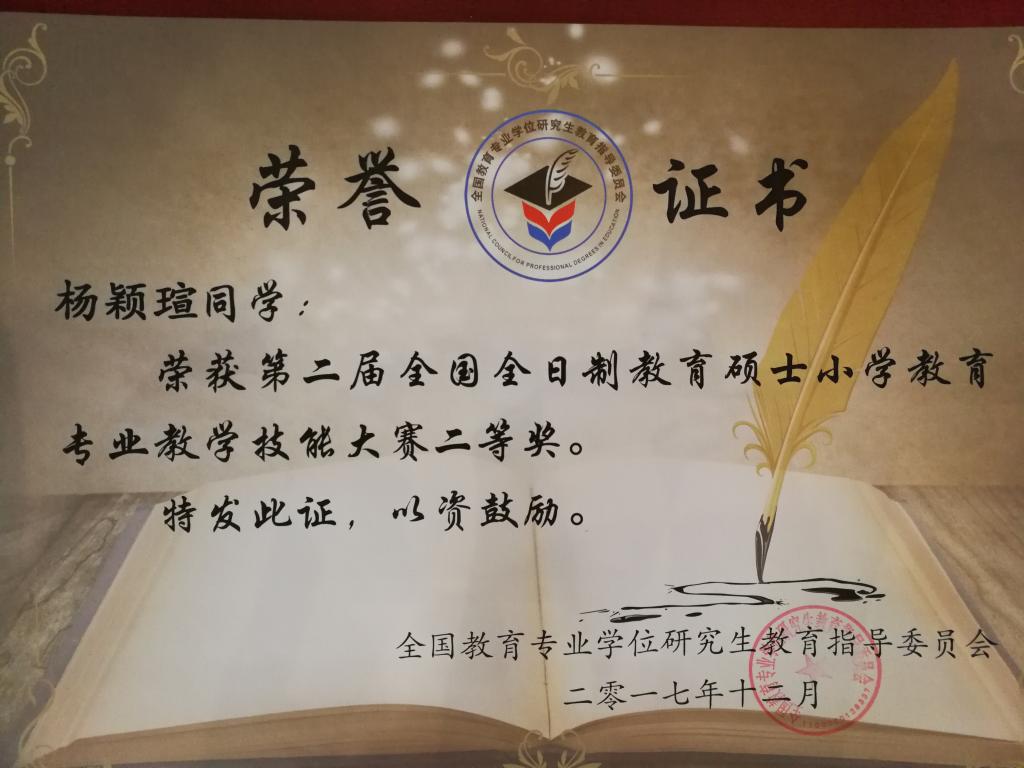 12月14日-16日,由全国教育专业学位研究生教育指导委员会主办、河北师范大学承办的全国“全日制教育硕士小学教育专业教学技能大赛(决赛)”圆满落下帷幕。决赛采用现场抽题、80分钟备课、讲课与答辩三个环节。经过激烈角逐,Beat365参赛选手2017级小学教育专业研究生杨颖萱获二等奖,2016级小学教育专业研究生翁燚获优胜奖。