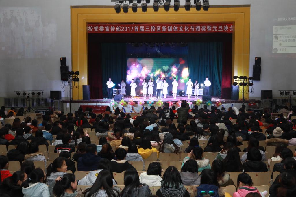 在开发区校区举办首届新媒体文化节汇报演出暨元旦晚会上,校党委宣传部、外国语学院、教育学院、文法学院等单位的负责同志为开发区校区文化节中创意视频、校园好声音、征文寄语、海报设计、摄影作品、漫画作品六个板块获奖同学颁奖。五位好声音歌手忘情演唱,层层角逐,更有外国留学生热情参与一展歌喉,展示中外友谊。