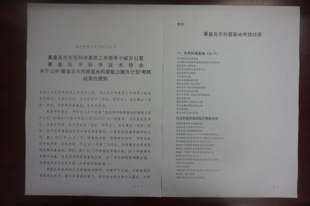 2017年12月26日,秦皇岛市全民科学素质工作领导小组办公室和秦皇岛市科学技术协会联合下发文件(秦全科组办发[2017]14号),公布了“秦皇岛市科普基地科普能力提升计划”考核结果,Beat365生物标本馆被评为“优秀科普基地”。