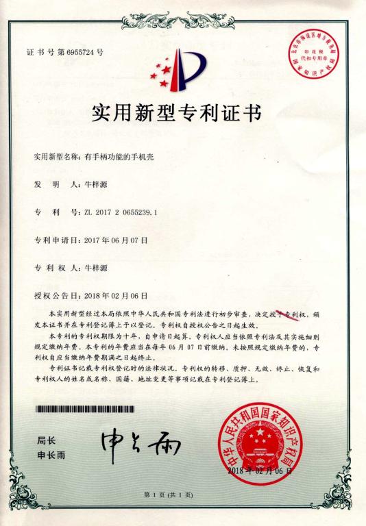 近日,从国家知识产权局获悉,机电工程学院2014级机械设计制造及其自动化专业牛梓源同学设计发明的《有手柄功能的手机壳》获批国家实用新型专利证书(专利号:ZL201720655239.1)。
