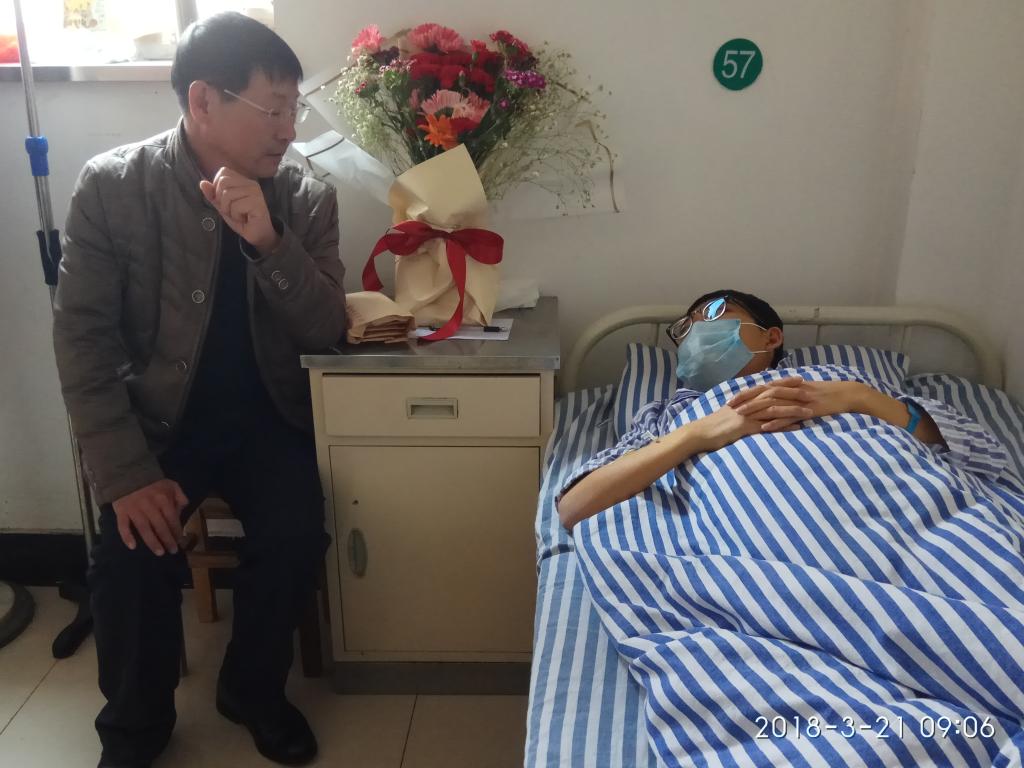 在医院里,张福喜向霍文博同学及其家长详细了解了他的病情、治疗措施和饮食、休息等方面的情况,向他们转达了学校党政领导和全校师生的关心与问候,并将学校师生的第二批捐款交到了霍文博同学的手中。张福喜副校长积极鼓励文博同学能像以前一样乐观向上,一定要相信现代医学技术,一定要坚定战胜病魔的信心,早日回到校园与老师同学们共同学习、生活。