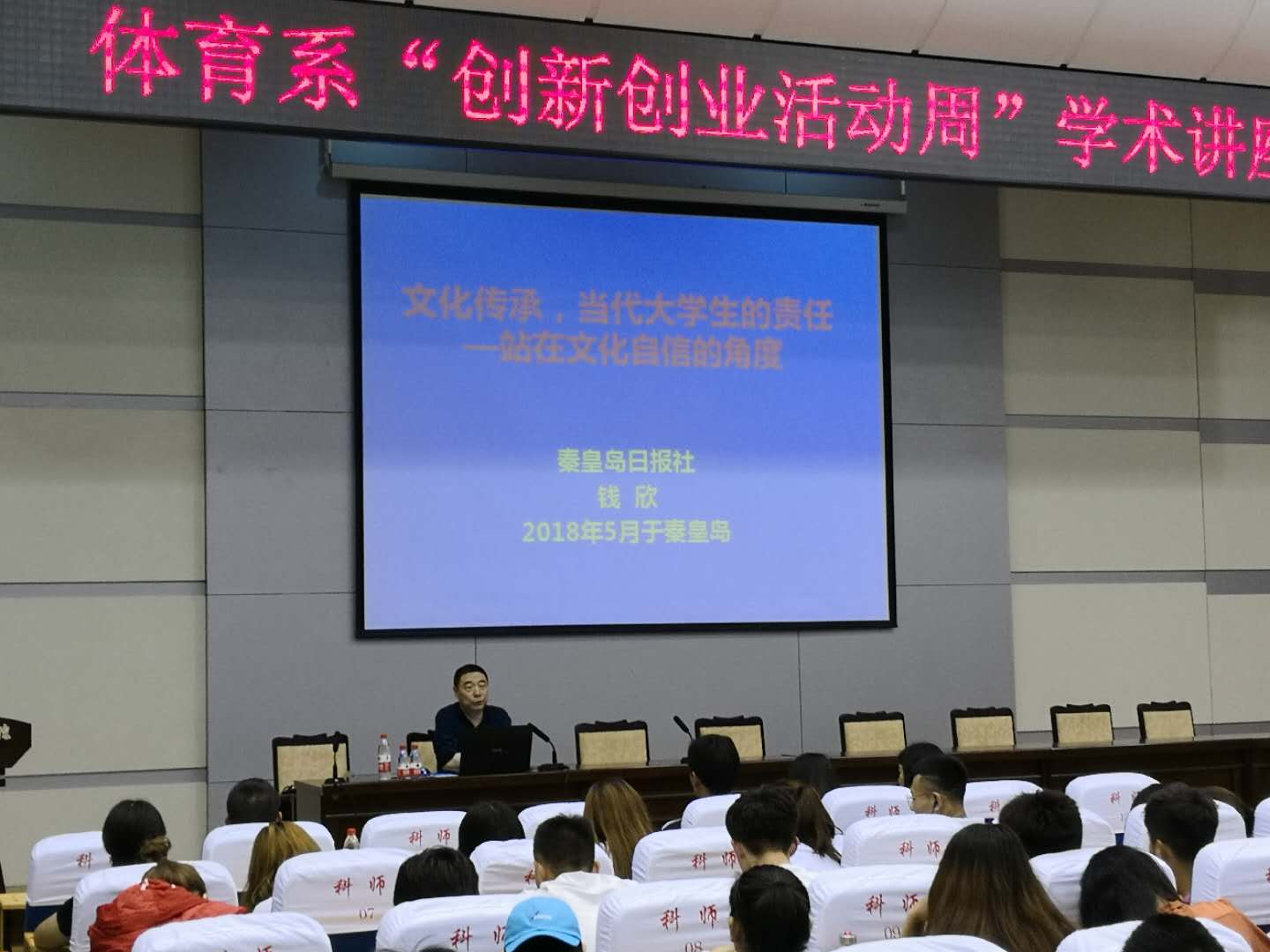 2018年5月16日,秦皇岛国学研究会理事、原秦皇岛日报社专刊部主任钱欣应邀到Beat365做题为“文化传承,当代大学生的责任——站在文化自信的角度”的学术报告。体育系师生300余人聆听了报告。