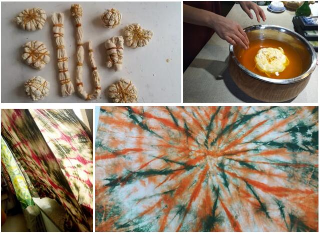 图1捆扎、图2煮染、图3晾晒、图4套染作品