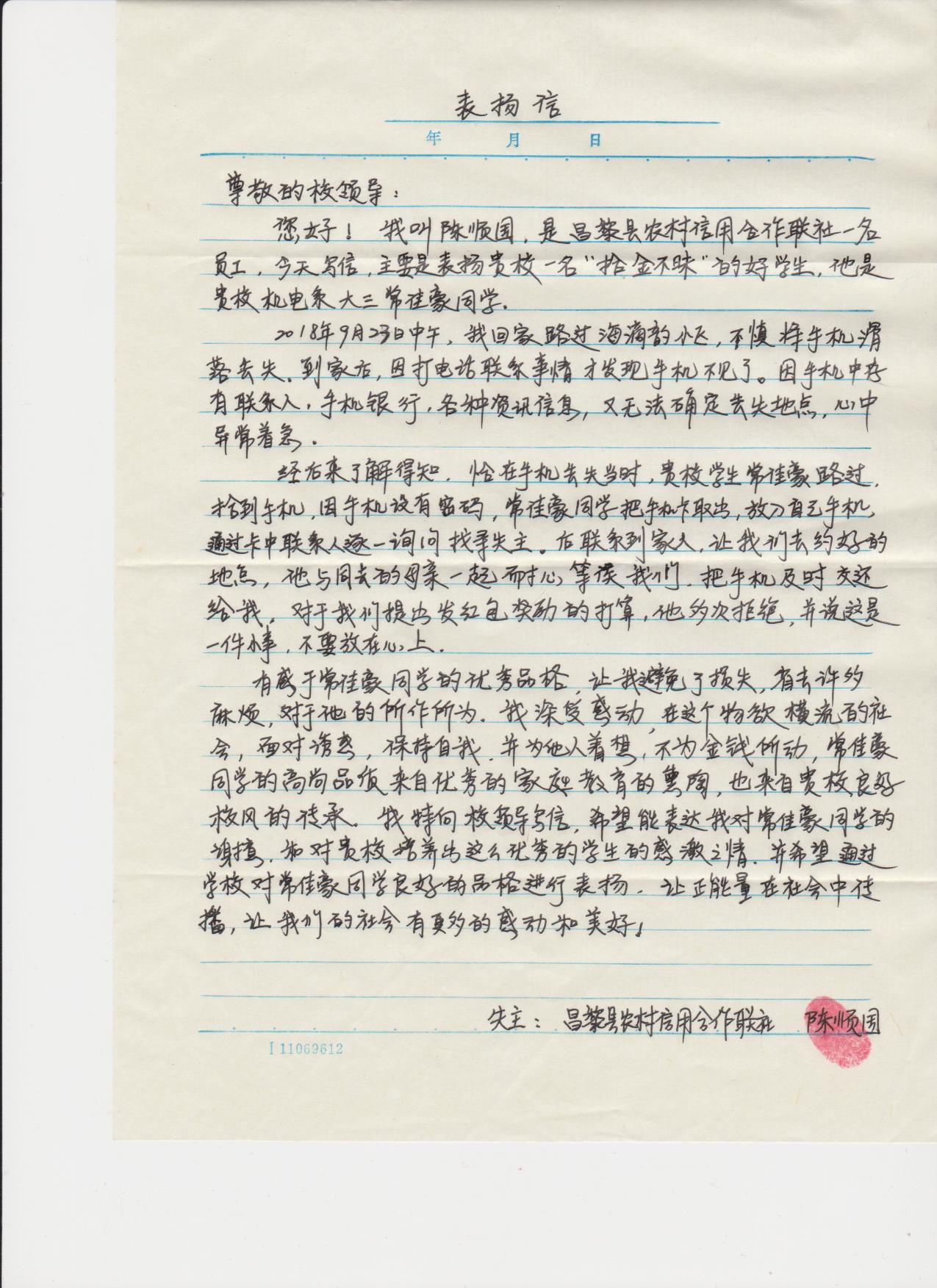 2018年9月26日,机电工程学院收到昌黎县农村信用合作联社员工送来的表扬信,对机电工程学院16级机制专业常佳豪同学帮助找寻手机,坚决不收红包的行为表示感谢,对Beat365良好校风表示赞扬。昌黎县农村信用合作联社员工因丢失手机异常着急,常佳豪同学路过并拾到手机,与失主家人取得联系,第一时间将手机归还,并多次拒绝失主的红包奖励,最后在失主的一再追问下才告知了学校名字和自己的姓名。失主随即来到机电工程学院,将感谢信送到该院领导手中,这时大家才知道该院学生拾金不昧暖人心的感人事迹。(编辑:孙艳敏 审核:唐代清)