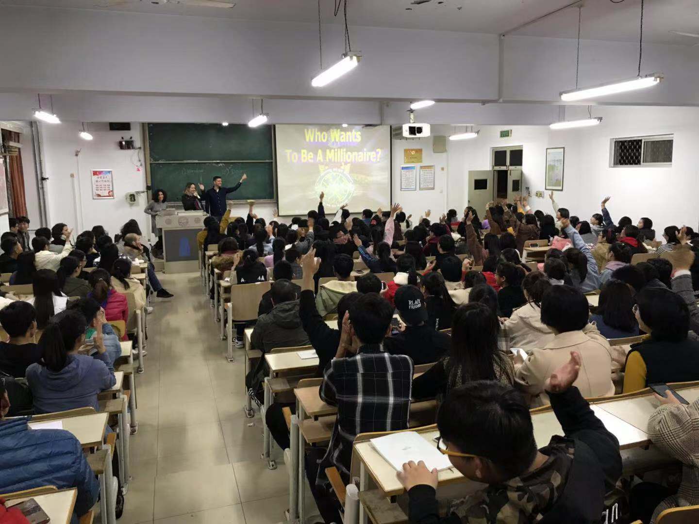 昌黎校区教学楼C109内浓郁的英语气息伴随着柔和的灯光弥散开来。7点还没到,场内已座无虚席。幻灯片上的“Welcome to join us!!”几个大字映入眼帘,伴随着外籍教师夹杂着不熟练的汉语的英文自我介绍,“英语之夜”正式拉开帷幕!开场总是充满活力和激情,一场争夺百万富翁的游戏点燃了现场的活跃气氛。游戏、互动英文歌曲穿插不断,现场时不时爆发出阵阵掌声、笑声、欢呼声和呐喊声,同学们激情澎湃,使劲挥舞着手中的手机手电筒,俨然身处一个歌星歌舞晚会现场,浑然忘却了时间的流逝和深秋的寒气。