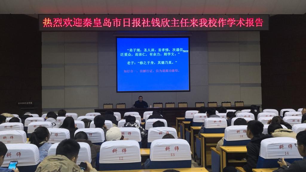 11月2日,秦皇岛日报社高级记者钱欣应体育系邀请,在秦皇岛校区学术报告厅做题为“做自己的主宰——中华圣贤告诉你”的报告。体育系400余名师生聆听了报告。钱欣从习近平总书记在全国教育大会上提出的“立德树人是教育的根本任务”和“读优秀传统文化书籍,是一种以一当十、含金量高的文化阅读。”作为开篇,从“读书真的无用吗?”“读经典,知行合一”“孝道是做人的根本”“礼,与世界相处的秘密”和“利他,职业成长的法则”五个方面,就大学生四年时光如何度过?学业与就业的关系等当代大学生存在的问题和关心的问题,通过中华传统文化的视角为大学生们进行了深刻分析。在两个多小时的报告中,钱欣旁征博引、深入浅出,对中华璀燦的优秀传统文化进行透彻分析,给师生们提供了一场民族文化的饕餮盛宴,对同学们四年的大学生活和未来走出校园后的人生发展富有极大的启迪意义。