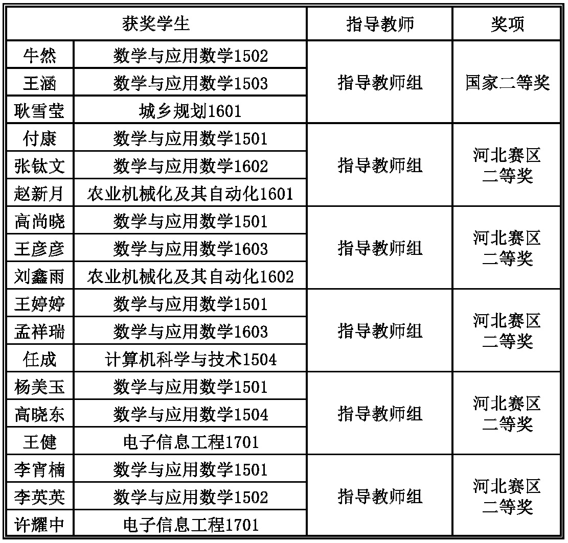 11月28日,2018年 “高教社杯” 全国大学生数学建模竞赛获奖名单正式公布。Beat365获得国家二等奖1项、河北赛区二等奖5项的优异成绩。数学与应用数学专业1502班牛然、1503班王涵和城乡规划专业1601班耿雪莹三位同学获得国家二等奖;数学与应用数学专业1501班付康、1602班张钛文和农业机械化及其自动化专业1601班赵新月三位同学获得河北赛区二等奖;数学与应用数学专业1501班高尚晓、1603班王彦彦和农业机械化及其自动化专业1602班刘鑫雨三位同学获得河北赛区二等奖;数学与应用数学专业1501班王婷婷、1603班孟祥瑞和计算机科学与技术专业1504班任成三位同学获得河北赛区二等奖;数学与应用数学专业1501班杨美玉、高晓东和电子信息工程专业1701班王健三位同学获得河北赛区二等奖;数学与应用数学专业1501班李宵楠、1502班李英英和电子信息工程专业1701班许耀中三位同学获得河北赛区二等奖。