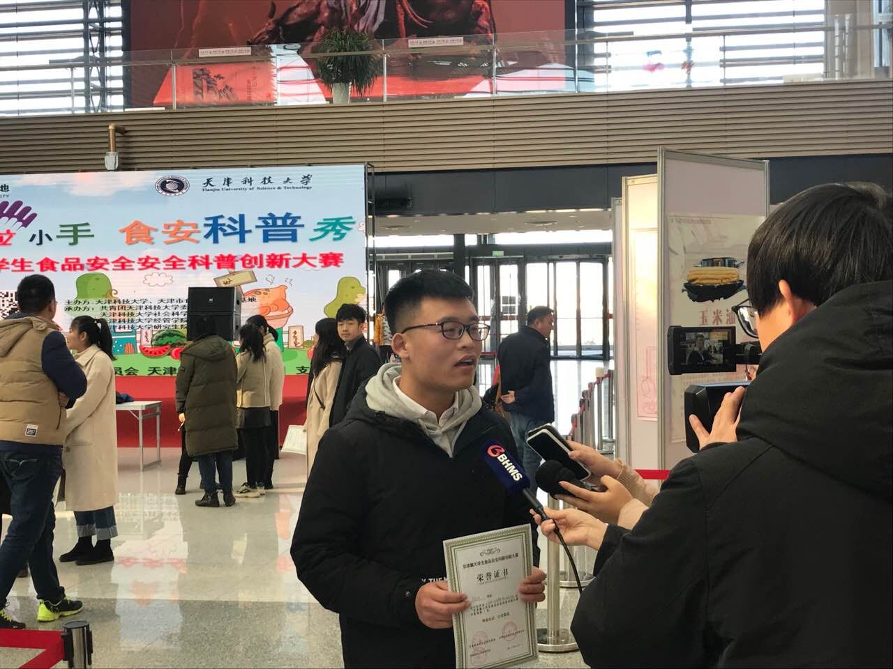 本次大赛分为海报组、H5组和视频组,大赛参赛学生作品经过组委会先期初选、学生投票、现场展播、评选等环节,Beat365学生有18件作品入围。最终,Beat3652017级食品质量与检验专业郭锦鑫同学荣获海报组第一名,2017级食品质量与检验专业纪迎新和吕文玥同学荣获H5组第一名,罗丽萍、史佳欣和杜美琪同学荣获H5组第三名。2016级食品质量与检验幻夜李国帅同学荣获视频组第二名(奖金2000元),并接受天津滨海新区电视台的采访。其他参赛同学荣获优秀奖,刘素稳老师获优秀指导教师奖。