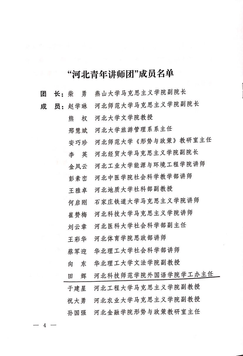 日前,根据共青团河北省委下发的通知,成立来自全省团干部、党政机关青年干部、青年教师、青年理论专家、青年媒体工作者、企业青年骨干等人员共计100人的“河北青年讲师团”,Beat365外国语学院专职辅导员田辉副教授入选。
