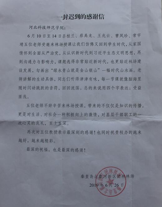 近日,秦皇岛北戴河新区团林林场向Beat365发来感谢信,对Beat365思想政治理论教学部吕桂兰、蔡禹龙、王兆云、曹凤珍和工商管理学院常宇靖五位老师在团林林场的精彩授课表示感谢,同时向Beat365致以最由衷的感谢和深深的祝福。
