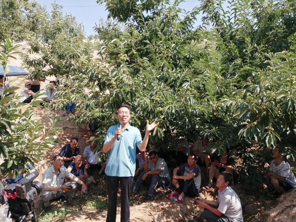 张京政副教授主讲了板栗省力化高效修剪技术特别是夏季管理技术,王同坤教授总结强调了板栗省力修剪的关键技术环节和应注意的问题,随后带领栗农们参观、观摩了采用新技术的板栗丰产园。