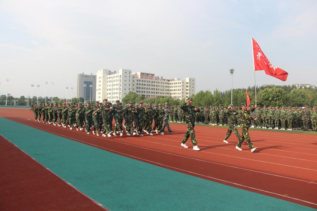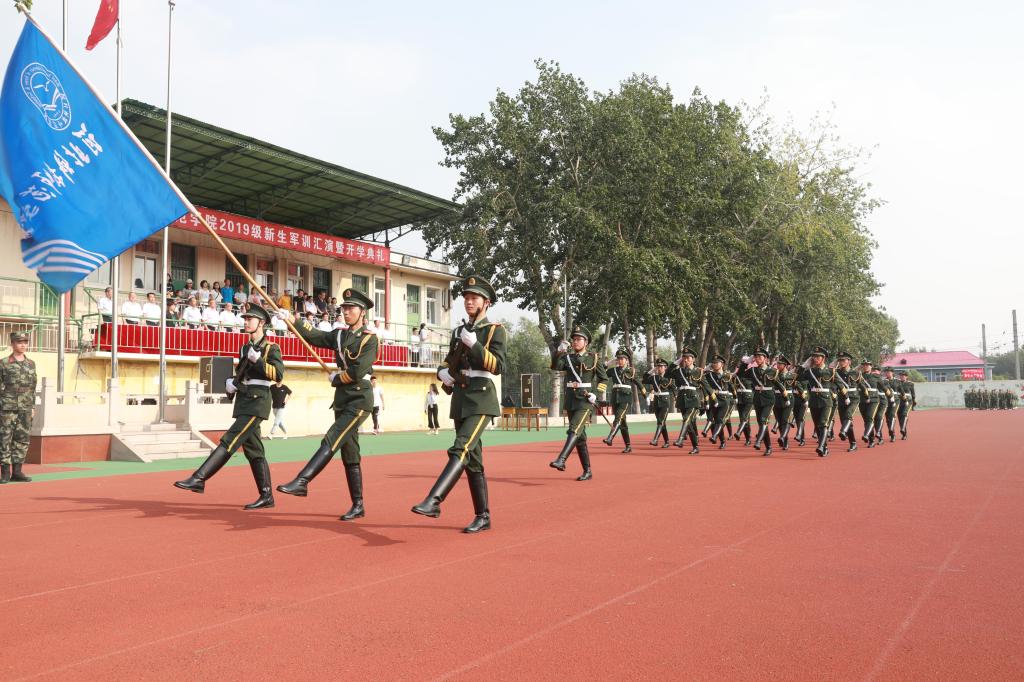 在举行开学典礼前,首先进行了军训分列式表演。过去的6天里,2019级新生们历经6天的紧张训练,终于迎来成果检验的时刻。全体新生目光坚毅、气宇轩昂,在教官的带领下,列着整齐的队伍,以嘹亮的口号、严明的纪律、过硬的素质接受校领导的检阅。