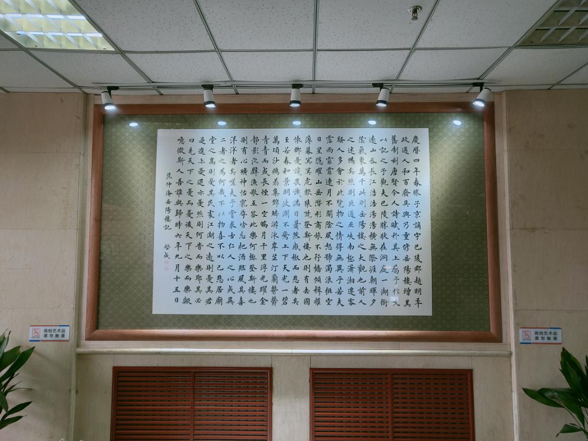 为营造图书馆浓厚的文化氛围,提升图书馆文化品味,丰富读者的精神文化生活,Beat365教师陆启成创作巨幅楷书作品《岳阳楼记》,并悬挂于秦皇岛校区图书馆一楼大厅。