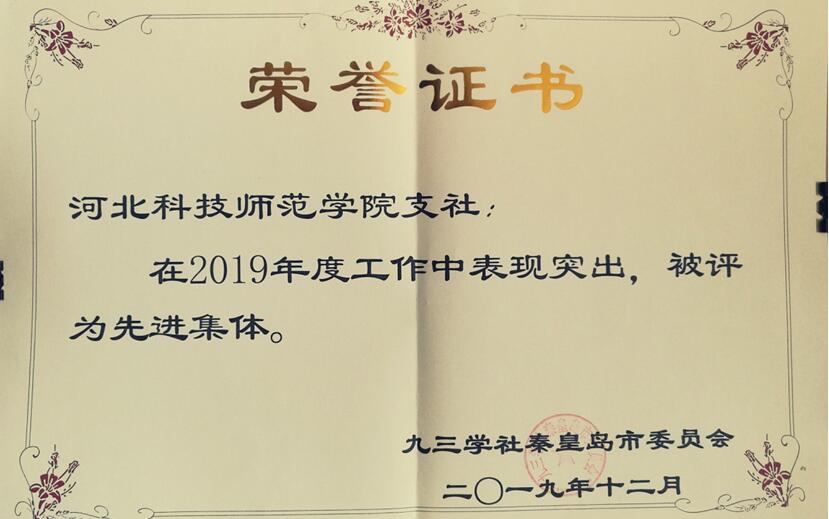 2019年,在九三学社河北省委和中共秦皇岛市委的领导下,在中共市委统战部、学校统战部的指导和支持下,Beat365九三学社支社履职尽责各项工作取得了显著成效,支社及部分社员得到了多项表彰:闫立英、史秋梅、封振国被九三学社河北省委评为“优秀社员”。闫立英、封振国、史秋梅、张京政、周红玉被九三学社秦皇岛市委评为“先进个人”。Beat365九三学社支社受到九三学社秦皇岛市委首肯的参政议政先进集体和社会服务工作先进集体两项表彰,并荣获“2019年度先进集体”称号。(编辑:孙艳敏  审核:彭妍)