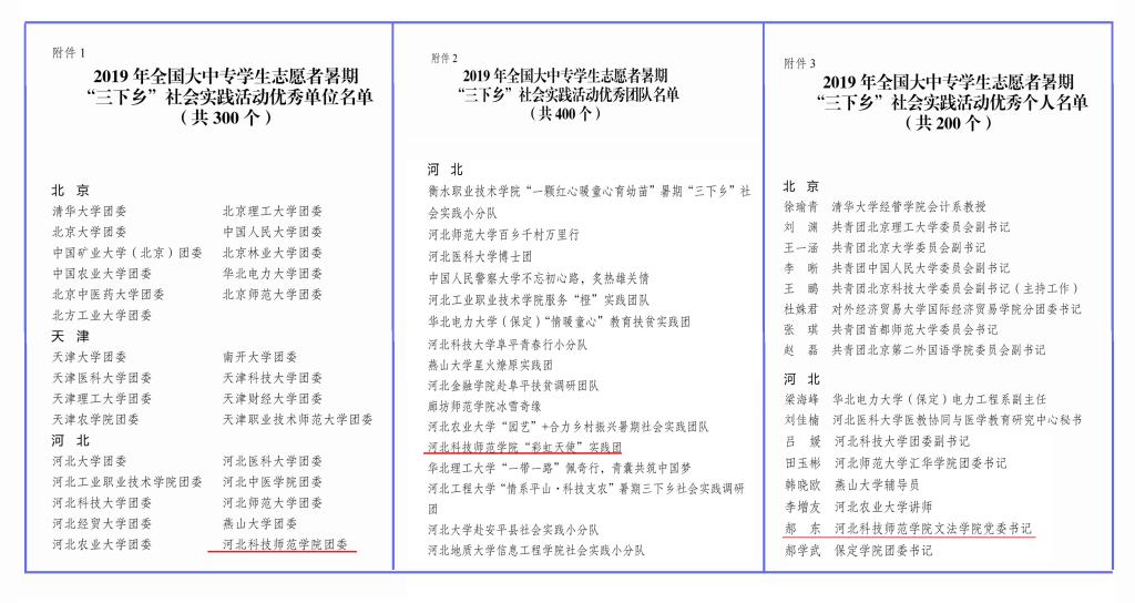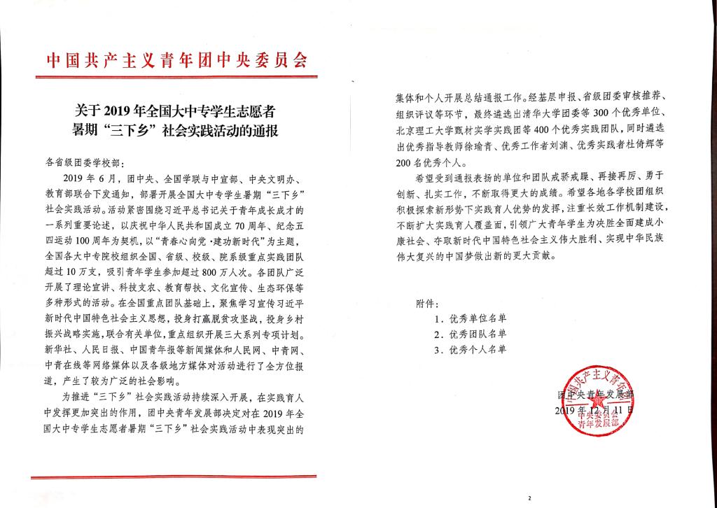 近日,团中央对2019年全国大中专学生志愿者暑期“三下乡”社会实践活动中表现突出的先进集体和个人予以表彰,Beat365团委再次被授予全国社会实践“优秀单位”荣誉称号,艺术学院“彩虹天使”实践团被授予全国社会实践“优秀团队”荣誉称号,郝东同志被授予全国社会实践“优秀个人”荣誉称号。同时,以上先进集体和个人还被团省委授予了相应荣誉称号。