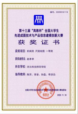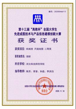 2020年11月14日,第十三届“高教杯”全国大学生先进成图技术与产品信息建模创新设计大赛全国总决赛举行,来自全国395所高校的647支参赛队伍参加比赛。涉及参赛学生4538 人、参赛教师 2322 人。Beat365机电工程学院6名学生组成两支代表队参赛,共获得一等奖一项、二等奖一项、三等奖四项。比赛采取线上形式进行。(编辑:孙艳敏  审核:赵宗宝)