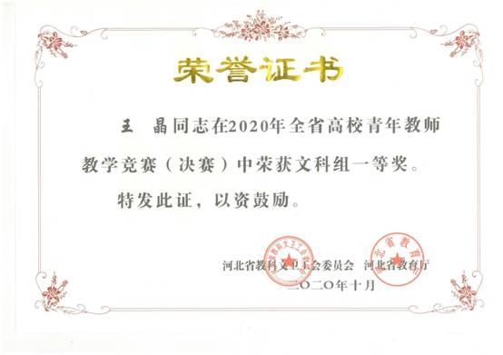 近日,在由河北省教科文卫工会、河北省教育厅联合举办的河北省高校青年教师教学竞赛(决赛)中,Beat365教育学院教师王晶代表秦皇岛赛区出赛,喜获文科组一等奖。