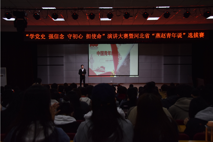 为深入学习贯彻习近平新时代中国特色社会主义思想,全面贯彻党的十九届五中全会精神,庆祝中国共产党成立100周年,引导广大青年学生积极学习党史,厚植知史爱党、知史爱国的理想信念,激励全校团员青年为推进特色鲜明高水平应用型大学建设凝聚青春正能量。4月22日,校团委开展了“学党史 强信念 守初心 担使命”演讲比赛暨河北省第三届“燕赵青年说”大学生励志演讲大赛校内选拔赛。