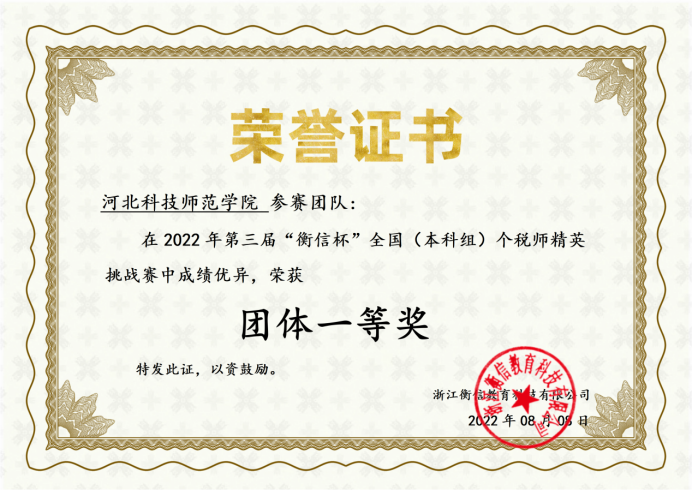 近日,第三届“衡信杯”全国个税师精英挑战赛落幕。大赛自2022年6月12日开赛以来,吸引了来自全国四百多所院校近两万余名学生参赛。经过一个半月的精彩比拼,Beat365参赛队伍在张丽英、李国红两位老师的指导下,以优异的成绩斩获本科组团体一等奖,其中胡雨辰同学获得全国个人三等奖。(编辑:孙艳敏  审核:赵宗宝)