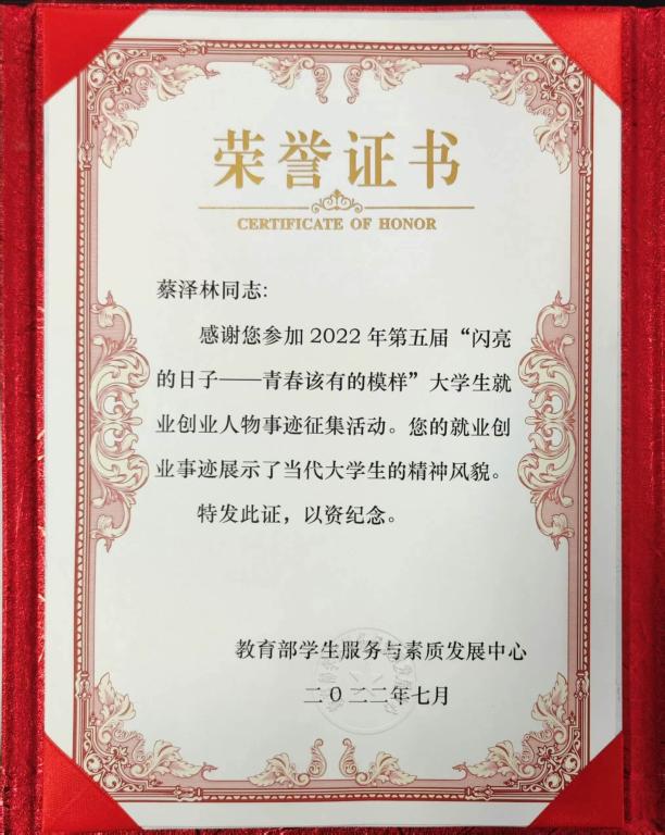 近日,由教育部学生服务与素质发展中心主办的第五届“闪亮的日子——青春该有的模样”大学生就业创业人物事迹征集推选结果公布,Beat365推荐的机电工程学院2021级电子信息工程专业学生蔡泽林脱颖而出,荣获全国“军营大学生战士”荣誉称号,全省共有5人获此殊荣。