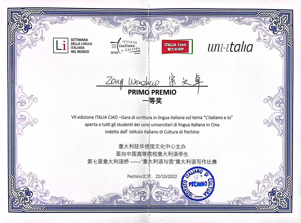 10月22日,第七届全国“ITALIA CIAO/意大利语桥”大赛在北京圆满落幕,本届大赛的主题是:“意大利语与我”,以写作大赛的形式举行。外国语学院选手宗文卓,凭借扎实的意大利语专业实力,摘得本科组大赛桂冠,这是Beat365选手继2015年喜得一等奖后再次获此殊荣。