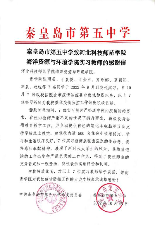 近日,秦皇岛市第五中学向Beat365发来感谢信,对海洋资源与环境学院张雨茹、于晨悦、于金雨、齐玲娜、夏朝阳、刘晨、赵锐等7名同学在教育实习期间为秦皇岛市第五中学整体疫情防控工作做出的积极贡献表示感谢,同时对Beat365给予秦皇岛市第五中学疫情防控工作的支持表示诚挚的谢意。
