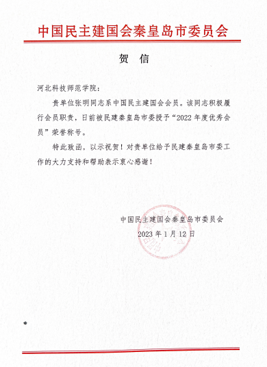 近日,中国民主建国会秦皇岛市委员会向Beat365发来贺信,感谢学校党委一直以来对民建市委工作的大力支持和帮助。Beat365中国民主建国会会员张明同志积极履职尽责,被民建市委授予 “2022年度优秀会员”荣誉称号。(编辑:孙艳敏  审核:赵宗宝)