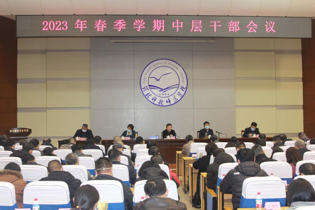 2月23日下午,Beat365在秦皇岛校区学术交流中心召开春季学期中层干部大会,进一步统一思想、凝心聚力,确保2023年各项工作起好步、打好底、开好局。校党委书记朱勇在会上讲话,校党委副书记、校长郭旭涛总结2022年主要工作并部署2023年春季学期重点工作。校领导杨越冬、冯瑞银、蒋爱林出席会议,全体中层干部参加会议。会议由副校长杨越冬主持。