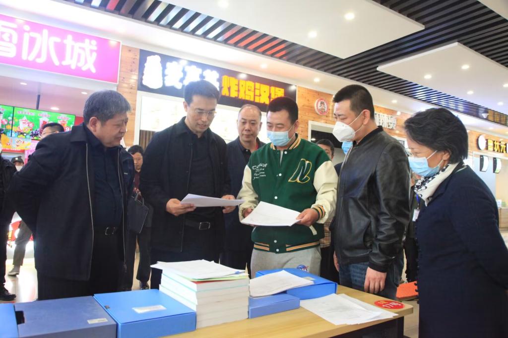 李国强(左二)一行认真查阅了相关工作记录、检查记录