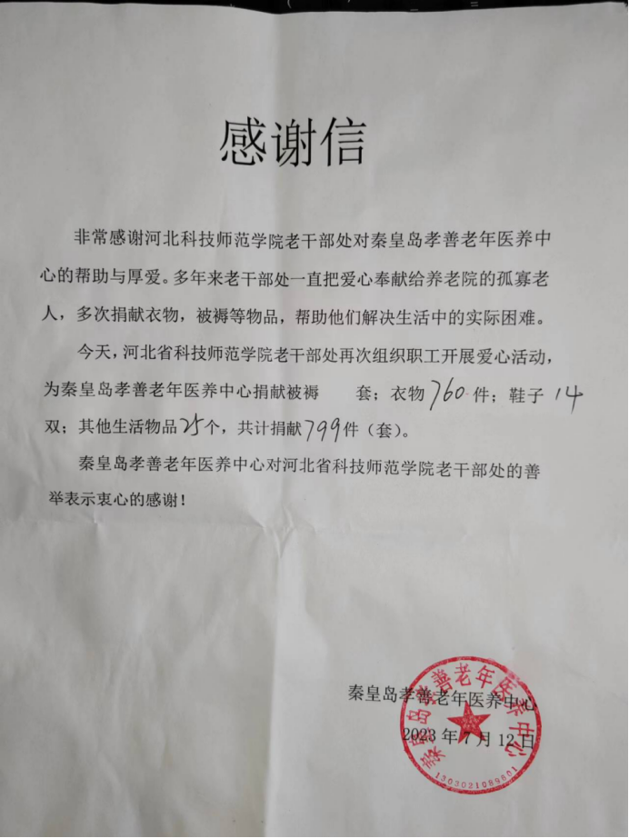 2023年7月12日,离退休人员党总支将满载爱心的799件衣物送交秦皇岛市孝善医养中心。