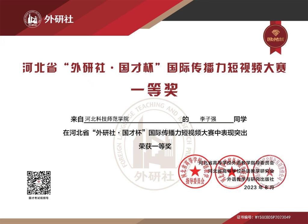 外院学子李子强荣获第三届“外研社·国才杯”国际传播力短视频大赛河北赛区一等奖