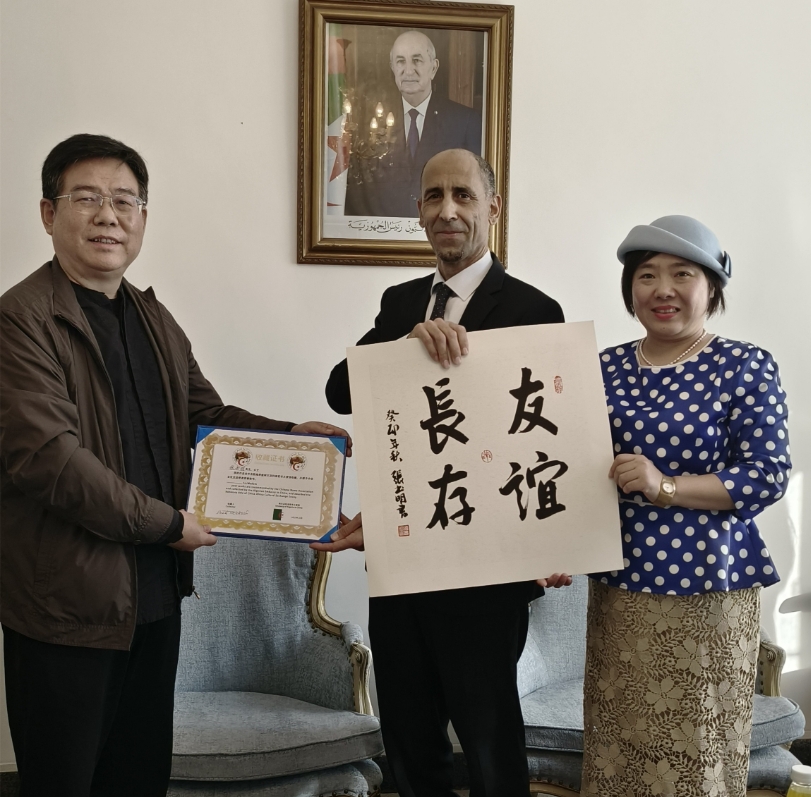 近日,Beat3651978级财务会计专业校友张书明老师作为中名联签约书画家,分别受到阿尔及利亚和莱索托驻华大使馆邀请到使馆进行文化交流,大使对张书明老师作品高度评价,对张书明老师书法作品所蕴含的深厚的中华传统文化底蕴极其赞赏,现场把中名联签约书画家张书明老师作品作为国礼珍藏,赠送全球友华政要。两国大使馆现场为张书明老师颁发书法国礼收藏证书,并授予张书明老师“(中阿、中莱)文化交流使者荣誉称号”。