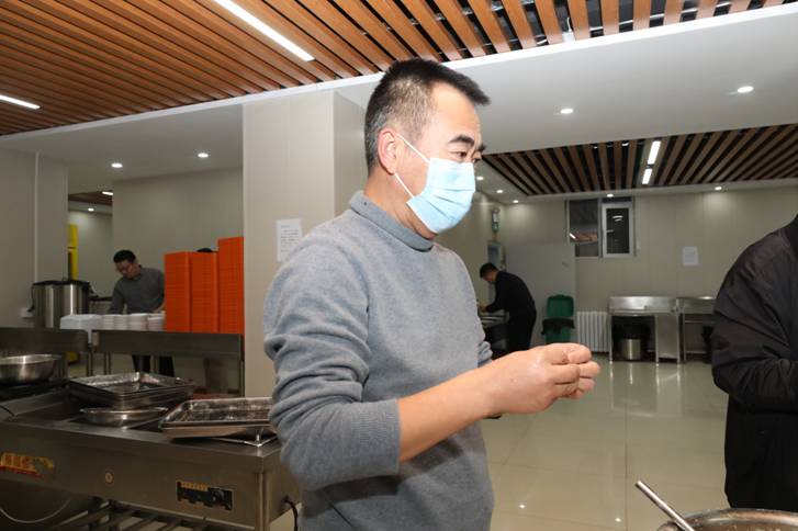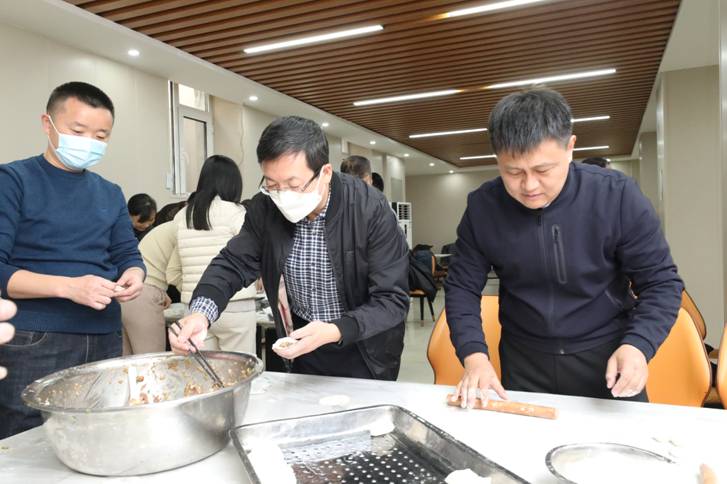 在职工餐厅,校领导与大家一同围桌而立,在欢快温馨的氛围中包着团圆饺,有的揉面、有的擀皮、有的拌馅、有的摆盘,分工协作、默契配合。每个人都用自己拿手的方式包着各式各样的饺子,唠家常话邻里,还时不时切磋一下包饺子的经验与趣事。不一会儿功夫,一盘盘紧实饱满的饺子就整齐地摆在了餐盘里。