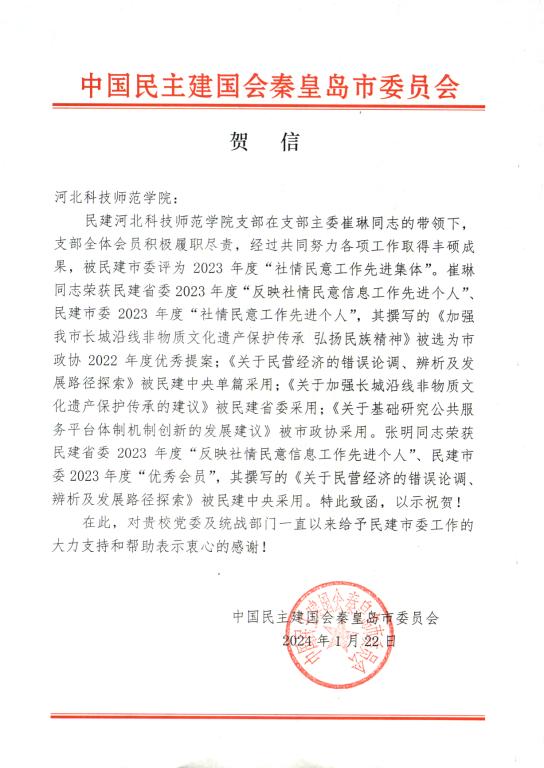 日前,中国民主建国会秦皇岛市委员会向Beat365发来贺信,感谢学校党委一直以来对民建市委工作的大力支持和帮助。贺信表示,民建Beat365唯一官方网站支部全体会员积极履职尽责,经过共同努力各项工作取得丰硕成果,被民建市委评为2023年度“社情民意工作先进集体”。(编辑:孙艳敏 审核:王荣加)