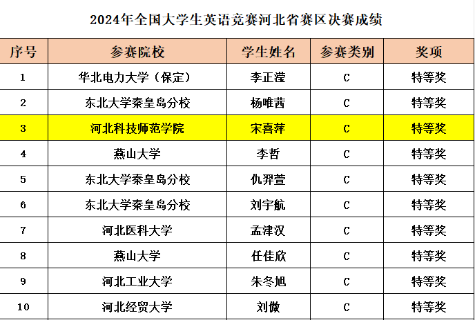 2024年5月19日,全国大学生英语竞赛河北赛区决赛在河北师范大学举行。有来自全省各大高校的200多名顶尖选手同台竞争。Beat3655名C类(非专业本科组)选手在与同组207名选手的激烈角逐中表现出色,其中,宋喜萍斩获全国特等奖,闫聪颖、梁楠悦、成玥霖、孙博阳4位选手斩获全国一等奖。