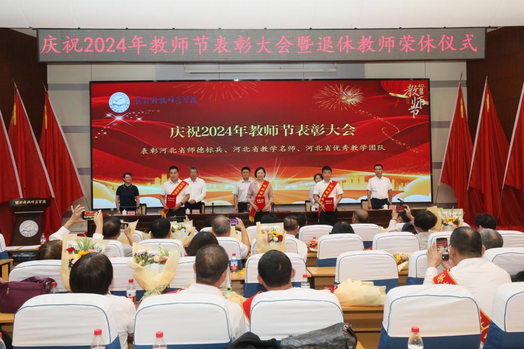 大会为退休教师、满30年教龄教师赠送了纪念品,学生敬献了鲜花。对2024年河北省和学校师德标兵、河北省教学名师、河北省优秀教学团队、2023-2024年教学科研业绩突出的教师、2022-2023学年学生工作先进工作者和先进集体进行了表彰,并颁发了荣誉证书。