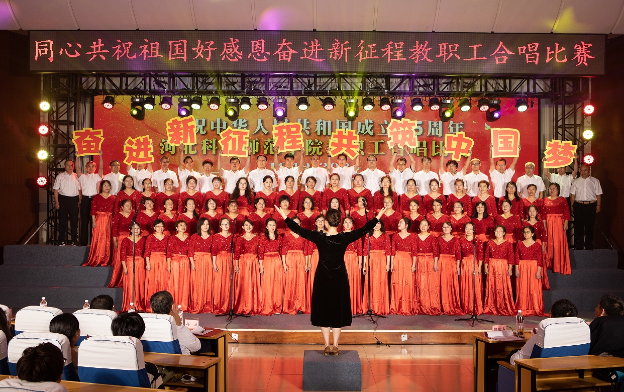老干部合唱团倾情演绎了《七律长征》《毛委员和我们在一起》两首歌曲,为全校教职工合唱比赛拉开了帷幕。全校23个分工会全部参加比赛,各参赛队伍精神饱满、整齐有序先后登场,演绎出一首首饱含深情的曲目《万疆》《东方红》《我的中国心》《走向复兴》《歌唱祖国》……高昂的歌声、动人的旋律展现了科师人昂扬向上的精神风貌,唱出了全校广大干部职工对祖国的无限热爱和美好祝福。最终,合唱比赛在艺术学院激情演绎的《领航》《科技师院人之歌》中落下帷幕。