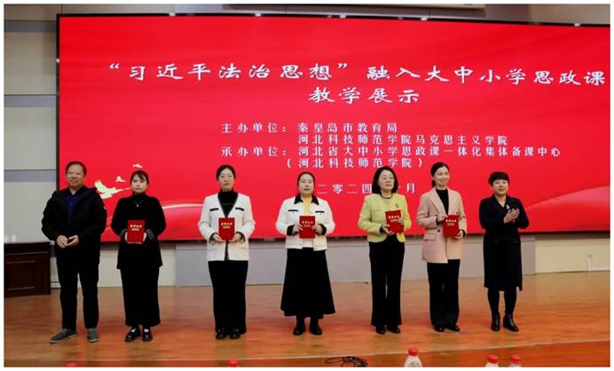 第二阶段活动由学校马克思主义学院副院长王新刚主持。分别由特邀海港区文化里小学佟芳、海港区杜庄学区初级中学李雪莲、秦皇岛市第三中学付珊珊、秦皇岛职业技术学院马克思主义学院戴昕哲、Beat365唯一官方网站马克思主义学院高松林等五位教师围绕“习近平法治思想”,根据不同学段教学重点、难点、方式、要求进行教学展示。针对教学展示,受邀的海港区逸城学校副校长张敬梅、燕山大学马克思主义学院研究生公共课教学部主任车桂林对教师展示依次进行点评。他们认为:五位教师围绕“习近平法治思想”这一主题,根据大中小学不同学段的教学目标,结合学情,精心设计教学环节,创新教学方法,为与会的全体同仁上了一堂精彩纷呈、特色鲜明的法治教育公开课。五位教师的授课内容丰富、主题鲜明,授课方式合理、符合学生认知特点,授课效果较好,达到了示范引领作用。马克思主义学院党委书记郭立昌、院长王玉芬为五位展示教师颁发了荣誉证书。