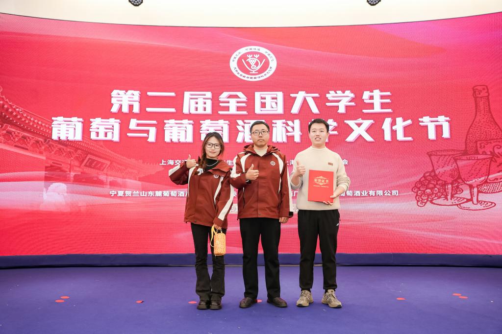 2024年11月24日,第二届全国大学生葡萄与葡萄酒科学文化节在上海交通大学闵行校区举办。食品科技学院暨葡萄酒学院阎贺静老师指导的研究生郭希庆、李菲的项目团队在“举杯贺兰山”大学生葡萄与葡萄酒科技创新大赛中荣获“银葡萄奖”。